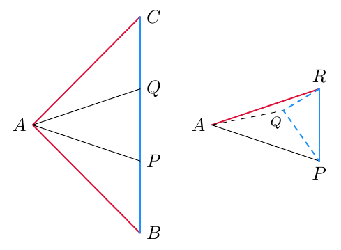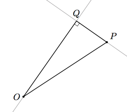 Tutkitaan tarkemmin kolmiota $OPQ$. Suorat on piirretty niin, että kulma $Q$ on suora kulma. Silloin jana $OP$ on suorakulmaisen kolmion $OPQ$ hypotenuusa. Siten jana $OQ$ on lyhyempi kuin jana $OP$.
