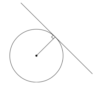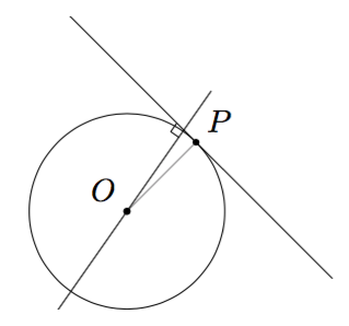 Olkoon ympyrän keskipiste $O$ ja tangentin sivuamispiste $P$. Piirretään ympyrän keskipisteen kautta suora, joka on kohtisuorassa tangenttia vastaan: