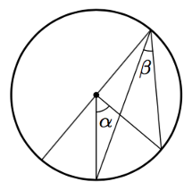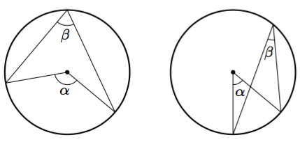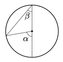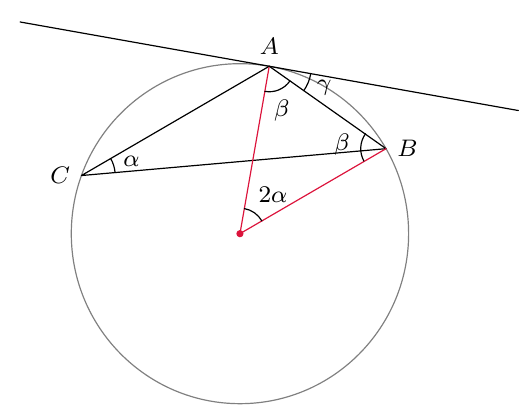 Alla on näkyvissä tangenttikulma ja sitä vastaava keskuskulma. Mitä voit päätellä niiden summasta $\alpha + \beta$?