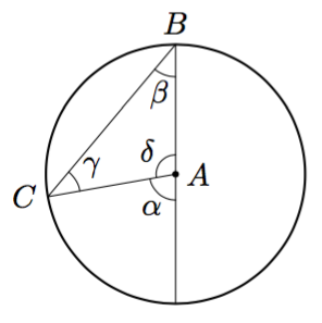 - Piirrä jokin toinen samaa kaarta vastaava kehäkulma samaan kuvaan. Anna sille nimeksi $\gamma$.