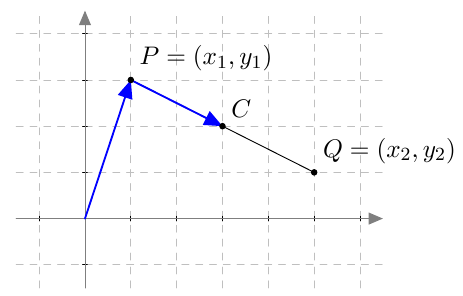Perustelu: Muodostetaan pisteen $C$ paikkavektori \begin{align*} \pv{OC} &= \pv{OP} + \frac{1}{2}\pv{PQ}. \end{align*} Kun siihen sijoitetaan \begin{align*} \pv{OP} &= x_1\vi + y_1\vj \\ \pv{PQ} &= (x_2-x_1)\vi + (y_2-y_1)\vj, \end{align*} paikkavektoriksi saadaan sievennyksen jälkeen \begin{align*} \pv{OC} &= \frac{1}{2}(x_1+x_2)\vi + \frac{1}{2}(y_1 + y_2)\vj. \end{align*} Paikkavektorista voidaan lukea pisteen $C$ koordinaatit. Siis $$ C = \left(\frac{x_1+x_2}{2}, \frac{y_1+y_2}{2}\right). $$