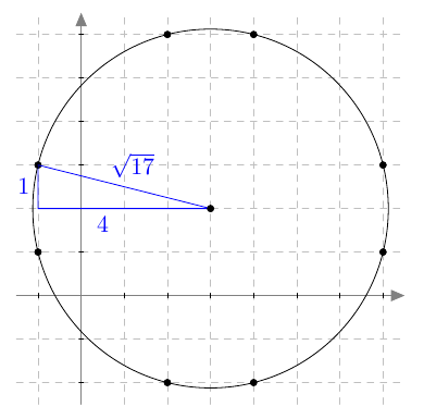Ympyrän piirtäminen tarkasti harpin avulla onnistuu joissakin tapauksissa silloinkin, kun ympyrän säde on irrationaaliluku. Ideana on soveltaa Pythagoraan lausetta. Esimerkiksi ympyrä, jonka keskipiste on $(3,2)$ ja säde $\sqrt{17}$, voidaan piirtää etsimällä pisteet, joihin päästään keskipisteestä siirtymällä neljä askelta vaakasuunnassa ja yksi askel pystysuunnassa, ja pisteet, joihin päästään keskipisteestä siirtymällä yksi askel vaakasuunnassa ja neljä askelta pystysuunnassa: